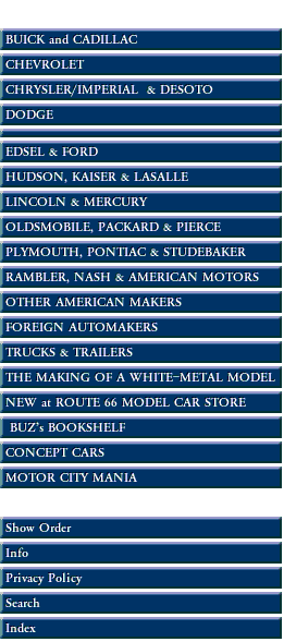 Welcome to the Route 66 Model Car Store. You will find an extensive selection of high quality white metal models in 1:43 scale. We are an authorized dealer for many premium manufacturers including : Conquest/Madison Models, Western Models; Highway Travelers, Minimarque, Brooklin Models and U.S. Model Mint.
